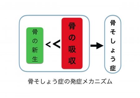 骨そしょう症の原因は、骨の中で常に行われている古い骨を壊し新しい骨で置き換えるという作業のバランスが崩れてしまうことです(図)。すなわち骨を壊す作業が骨を作る作業を上回ってしまうことで骨が弱くなってしまうのです。これには骨を壊す作業がより多く行われる場合、骨を作る作業がうまく行われない場合、その両方が生じている場合があります。