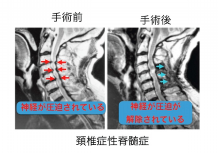 この病気の治療法ですが、残念ながら、手術以外に有効な治療法は現在のところありません。脊髄では障害された神経が機能を完全に失ってしまうと、その機能を取り戻すことは難しいため、比較的症状が軽いうちに手術をすることが勧められています。また、たとえ80歳をこえる高齢者であっても手術をすることで機能の改善が得られる可能性があるので、あきらめずに治療を行うことをお勧めします(図)。